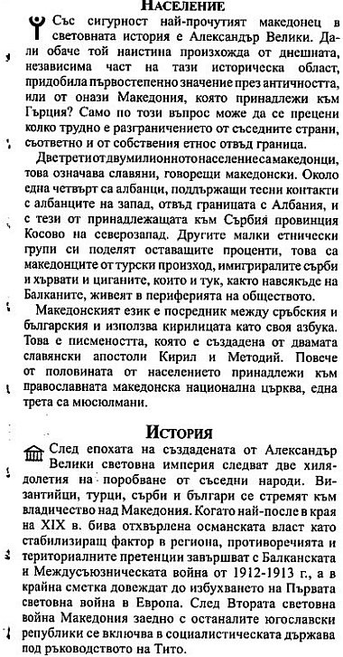 Предлагаме ви пример и от новата луксозна поредица, разпространявана в България като лицензирано специално издание за в. „Дневен Труд“ и „24 Часа“ – „Голяма енциклопедия на страните“ (в 16 тома). Текстът е в оригинал (т. 4., с. 440-441) и не се нуждае от коментар, но предизвиква основателни въпроси, напр. Кой има интерес от публикуването на подобни твърдения? Защото те се предлагат на българския читател от медии, претендиращи за обективност и достоверност на информацията, и за родолюбие...